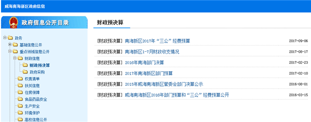 (二)推進財政資金信息公開。認真做好政府及部門預決算和“三公”經(jīng)費信息公開工作,通過威海南海新區(qū)政府門戶網(wǎng)站進行公開。