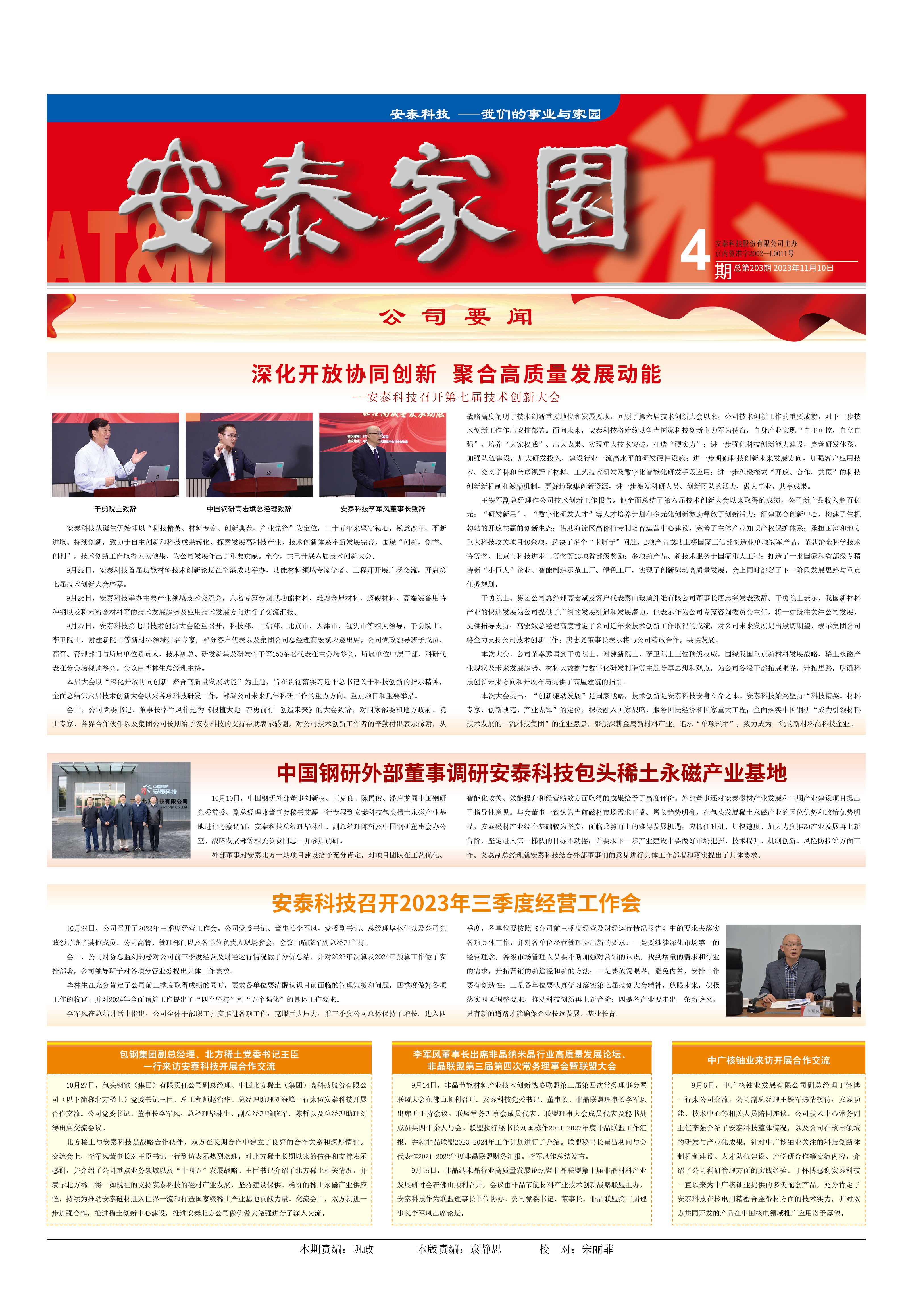 本次大會(huì)提出:“創(chuàng)新驅(qū)動(dòng)發(fā)展”是國(guó)家戰(zhàn)略,技術(shù)創(chuàng)新是安泰科技安身立命之本。安泰科技始終堅(jiān)持“科技精英、材料專家、創(chuàng)新典范、產(chǎn)業(yè)先鋒”的定位,積極融入國(guó)家戰(zhàn)略,服務(wù)國(guó)民經(jīng)濟(jì)和國(guó)家重大工程;全面落實(shí)中國(guó)鋼研“成為引領(lǐng)材料技術(shù)發(fā)展的一流科技集團(tuán)”的企業(yè)愿景,聚焦深耕金屬新材料產(chǎn)業(yè),追求“單項(xiàng)冠軍”,致力成為一流的新材料高科技企業(yè)。